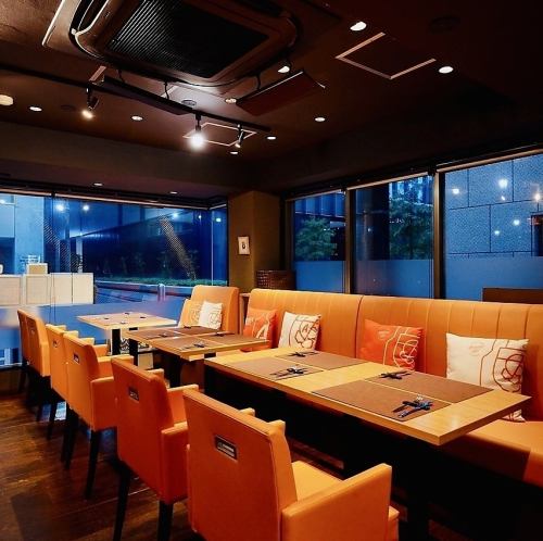 ◆最大14名様までお座りいただけるソファー席◆貸切の場合は最大18名様までご利用可能!黒のタイル張りの壁と個性的なオレンジのソファ席が特徴のオシャレな空間。開放感あふれる窓があるので、ゆったりとお寛ぎ下さい。各種宴会や歓送迎会・忘新年会・団体様・ママさん会などなど幅広いシーンでお気軽にご利用頂けます♪